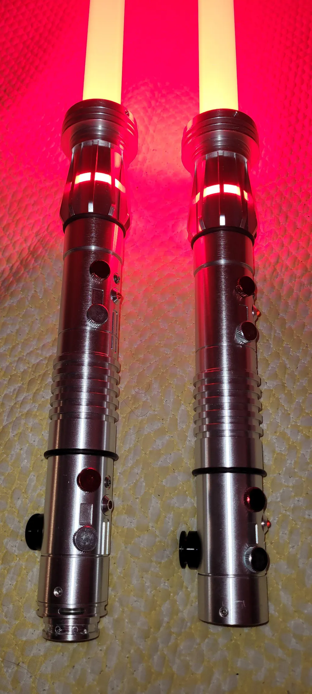 Like all other sabers on Saber Pro, the detail is top notch, and the colours and sounds are crisp, vibrant and have variety. My biggest gripes with the Maul saber in particular though are the connection between the 2 hilts is just held by several retention screws that loosen after hard striking. Also the fact you have to disassemble nearly the entire hilt to gain battery access instead of popping off the bottom like other sabers.