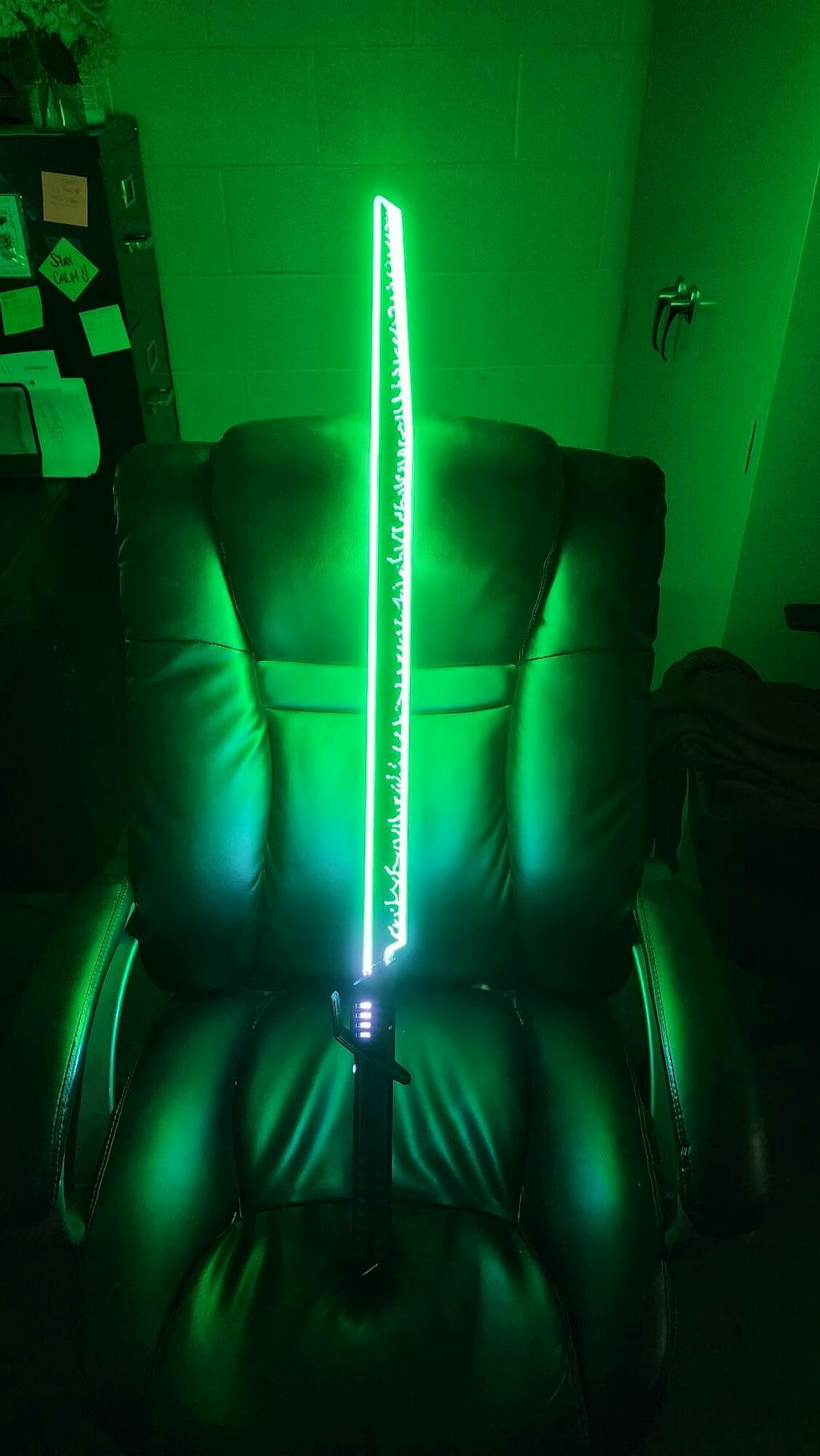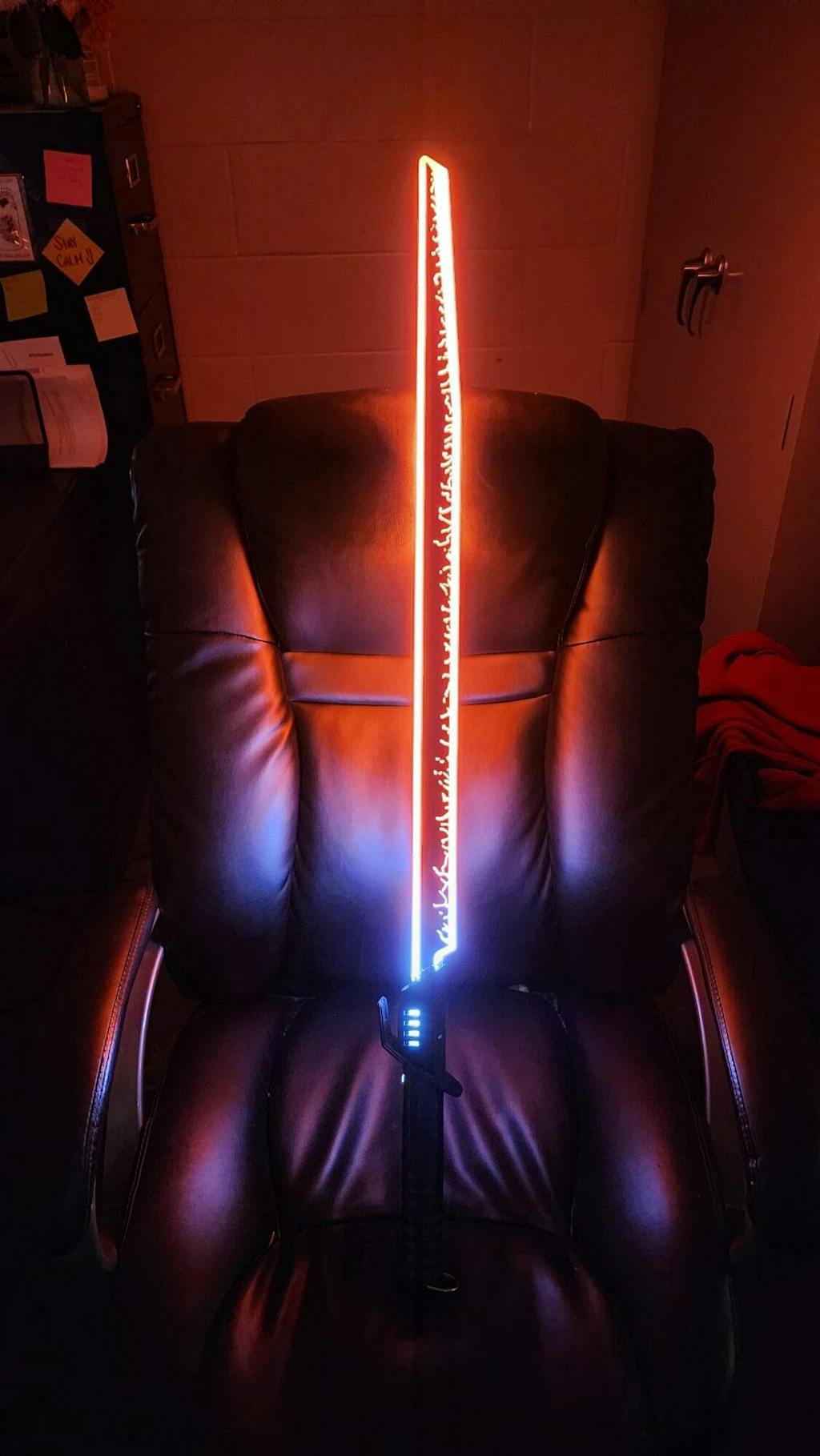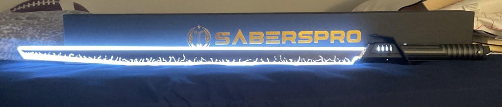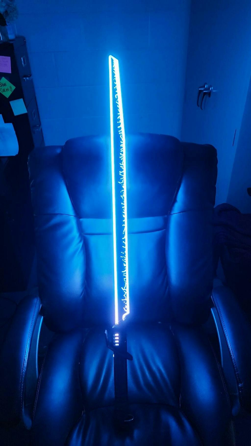 Det robuste polykarbonat flade klinge indeholder knitrende tegn af den sort-energi klinge langs kanten uden at svække følelsen af den virkelige kraft, der udsendes fra dette højt skattede symbol på myndighed. Dette er det samme design som det sagnomspundne lyssværd, der blev brugt i serien, som kunne ændre lederskabet blandt de trobaserede dusørjægere for altid. Det afrundede design langs T6 flyaluminiumsknappen møder skinnehåndbeskytteren perfekt, hvilket giver brugeren mulighed for at se en smule af den valgte farve, der udgør resten af lyssværdet.
