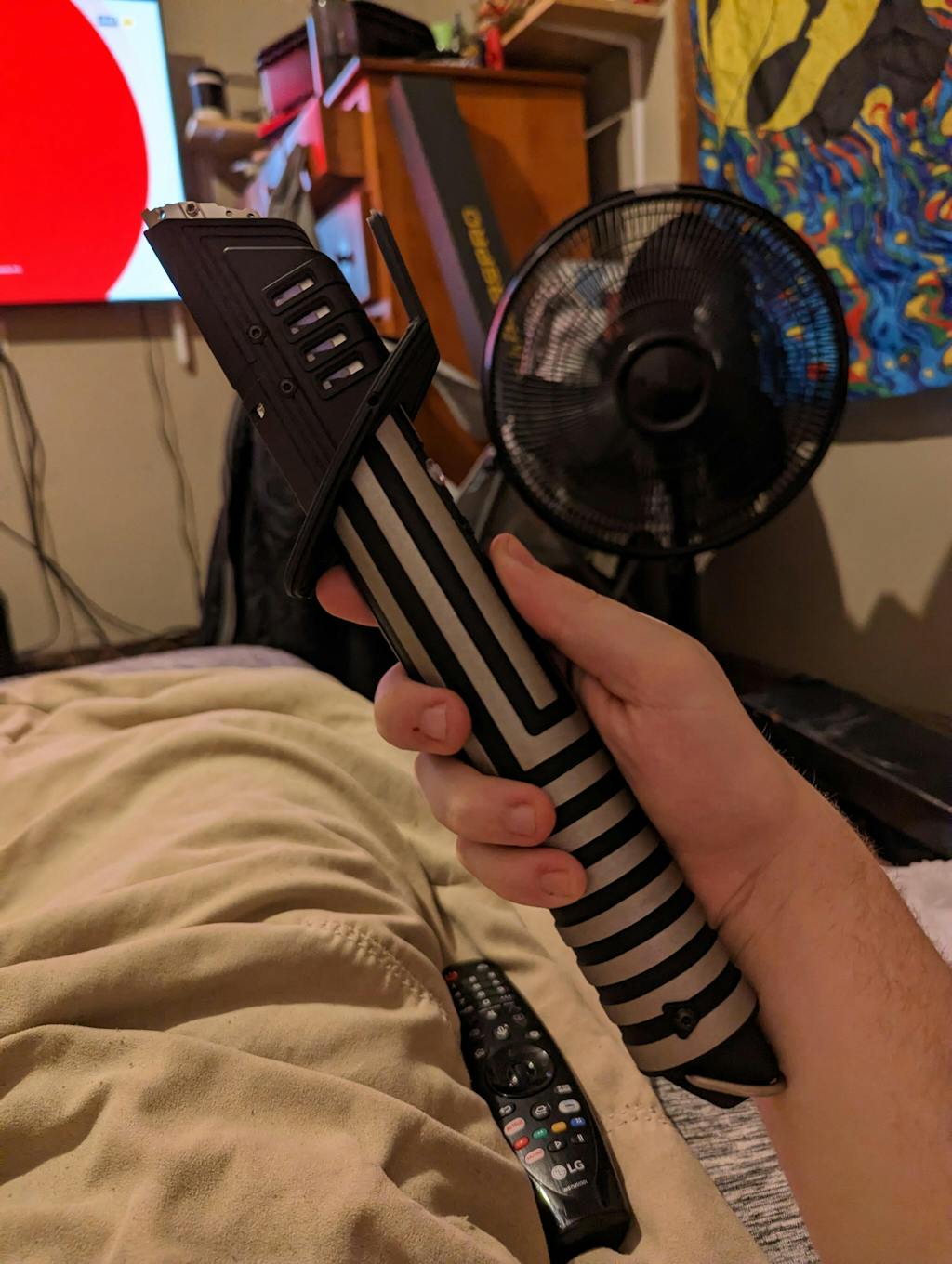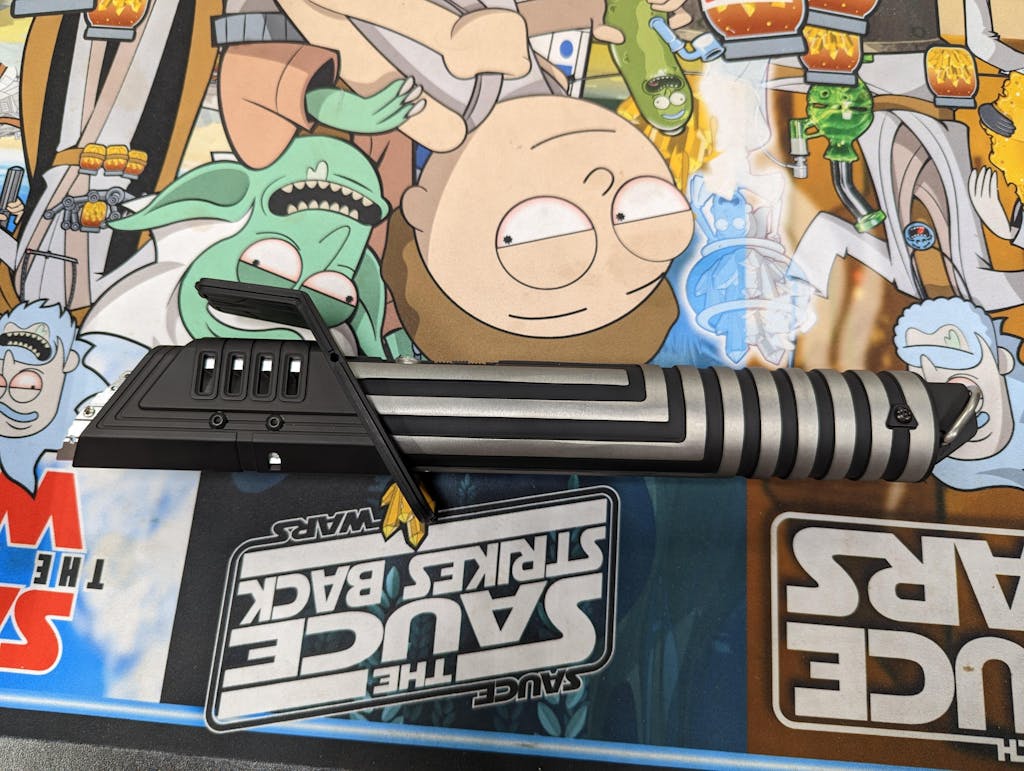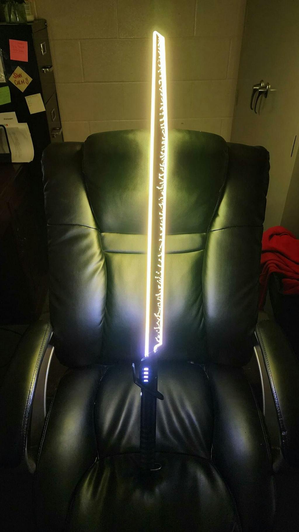 Det robuste polykarbonat flade klinge indeholder knitrende tegn af den sort-energi klinge langs kanten uden at svække følelsen af den virkelige kraft, der udsendes fra dette højt skattede symbol på myndighed. Dette er det samme design som det sagnomspundne lyssværd, der blev brugt i serien, som kunne ændre lederskabet blandt de trobaserede dusørjægere for altid. Det afrundede design langs T6 flyaluminiumsknappen møder skinnehåndbeskytteren perfekt, hvilket giver brugeren mulighed for at se en smule af den valgte farve, der udgør resten af lyssværdet.